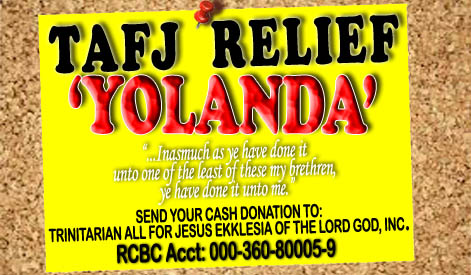 -TAFJ Relief For ‘Yolanda’ Victims Posted on November 18, 2013 in Uncategorized Go backYour message has been sent Name Of Donor(required) Warning Email Address (for acknowledgement)(required) Warning Amount (required) Warning Date Deposited/RCBC Branch(required) Warning Warning. Submit Δ Share this: Click to share on Reddit (Opens in new window) Reddit Click to email a link to a friend (Opens in new window) Email Click to share on Tumblr (Opens in new window) Tumblr Click to share on WhatsApp (Opens in new window) WhatsApp Click to print (Opens in new window) Print Click to share on Pocket (Opens in new window) Pocket Click to share on Facebook (Opens in new window) Facebook Click to share on X (Opens in new window) X Click to share on Pinterest (Opens in new window) Pinterest Click to share on LinkedIn (Opens in new window) LinkedIn Click to share on Telegram (Opens in new window) Telegram Like Loading...